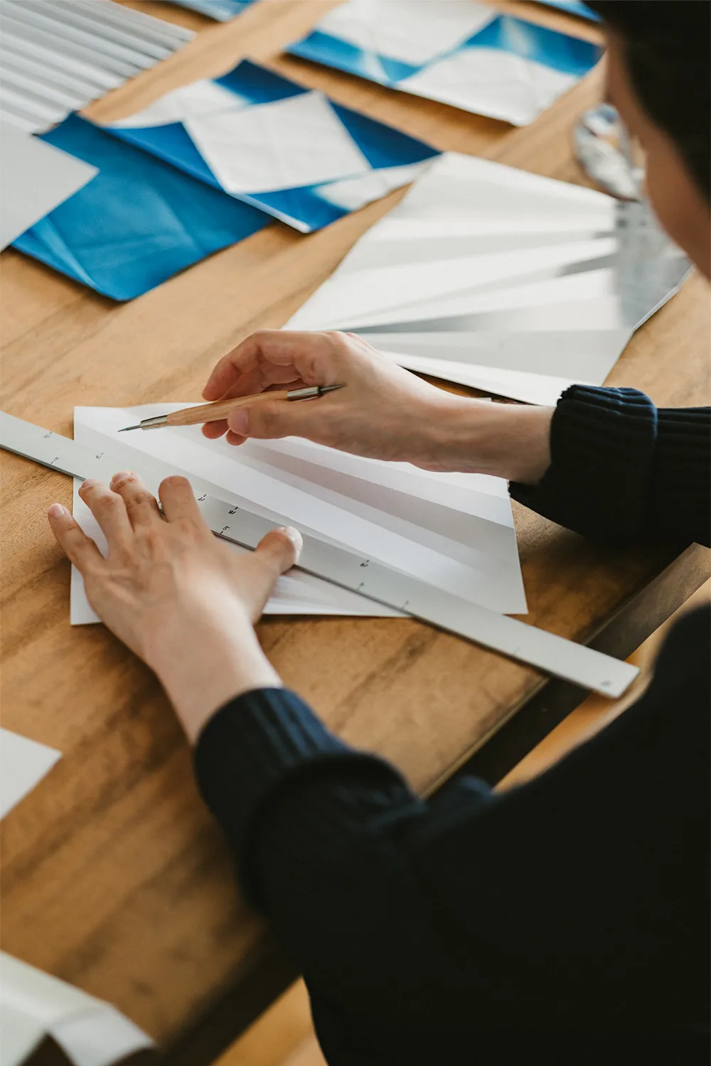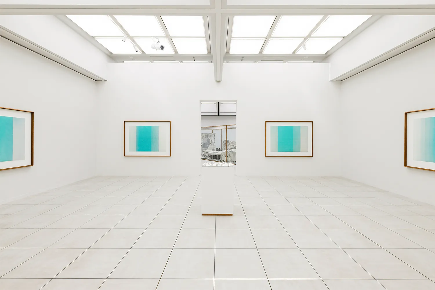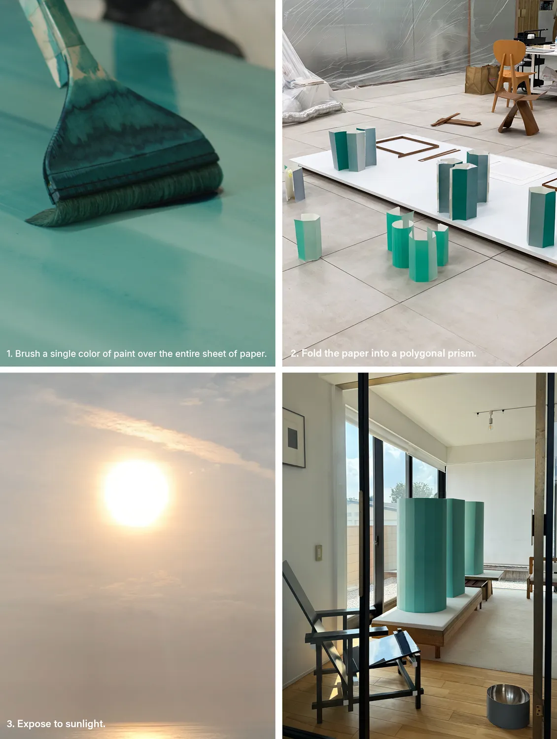 The Light and shadow inside me series comprises two types of works: those created using a sun-fading technique that result in a turquoise hue, and black-and-white pieces produced using silver gelatin paper and photogram techniques. The first work presented was made by folding watercolor paper—painted in a single shade of green—into a prism and exposing it to sunlight for several weeks, allowing the image to emerge through fading.