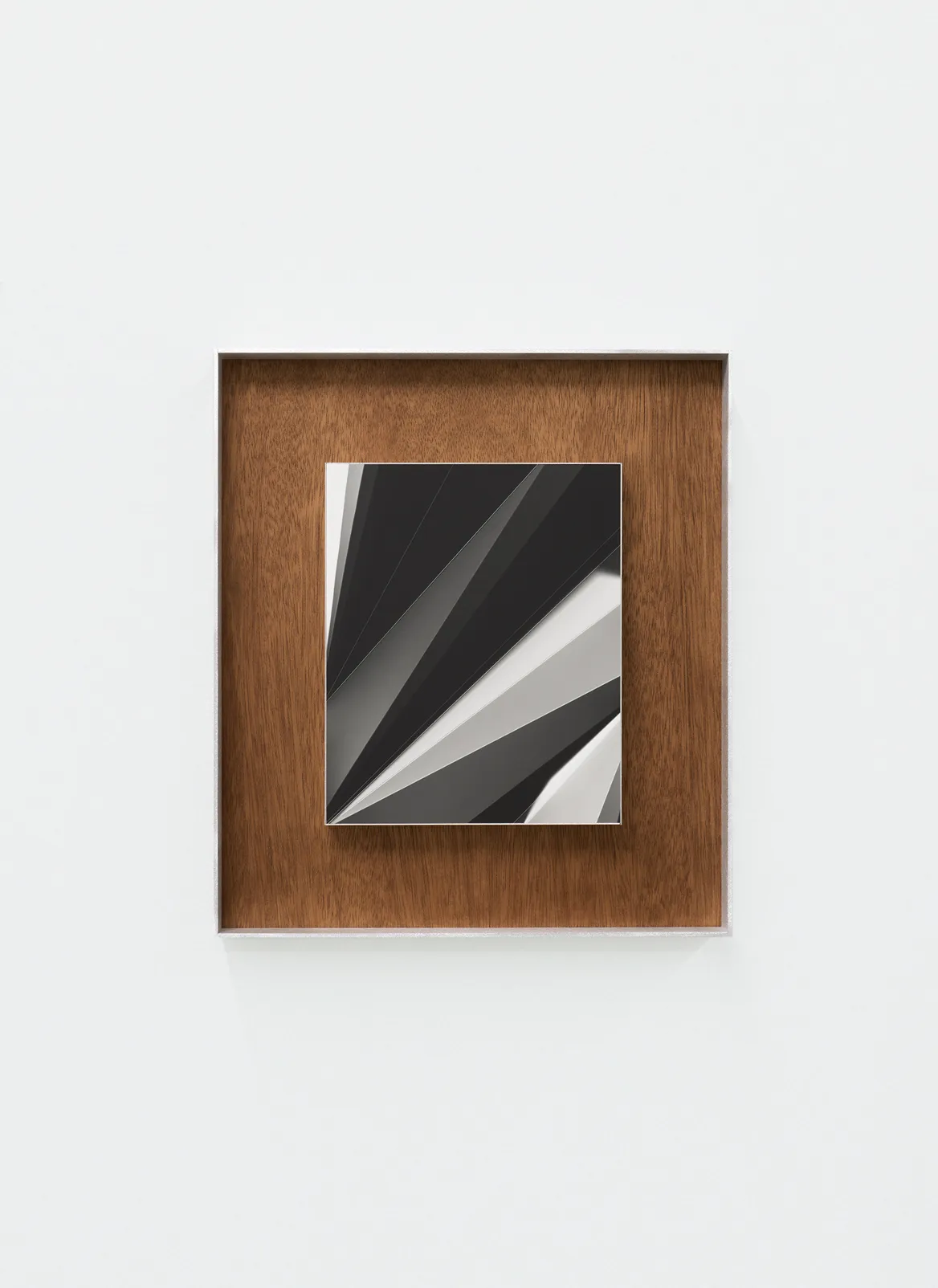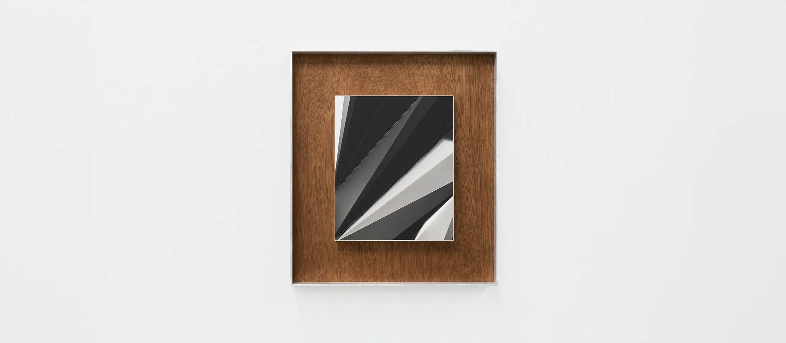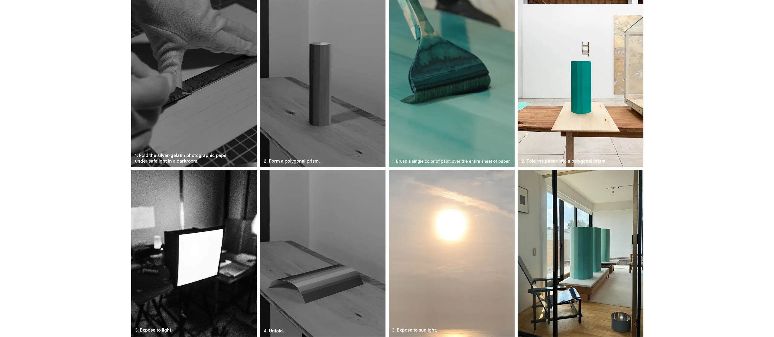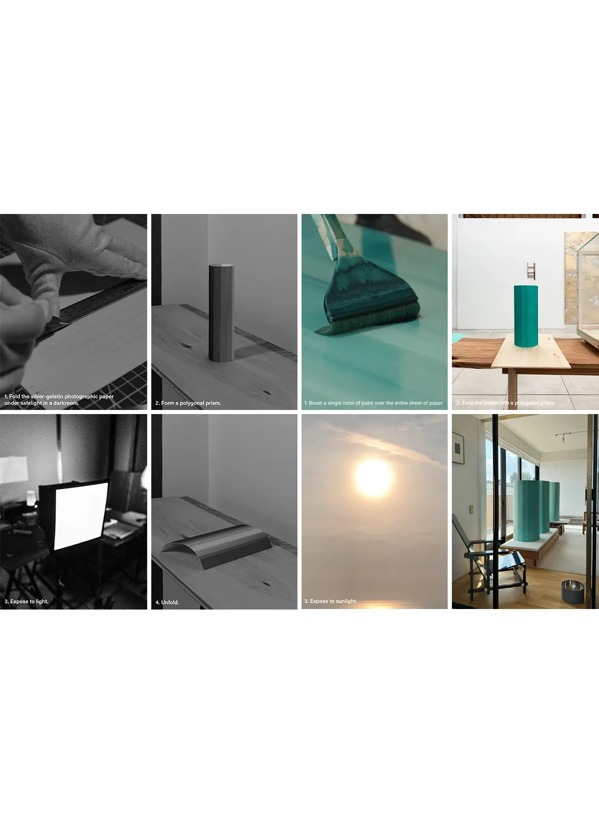 This series comprises two types: greenish-blue works made by folding a single sheet of coated watercolor paper into a polyhedral form, exposing it to sunlight, then unfolding it; and black-and-white photograms made in the same way on silver-gelatin photographic paper, exposed to a single light source. In the artist’s large, self-built darkroom, single sheets of photographic paper are hand-scored with straight fold lines—for example, up to 3m long—and folded into 48-sided forms before exposure. Using this method—capturing “only the light and shadow inherent to the object itself”—the gradations of light and shadow are fixed onto the paper…