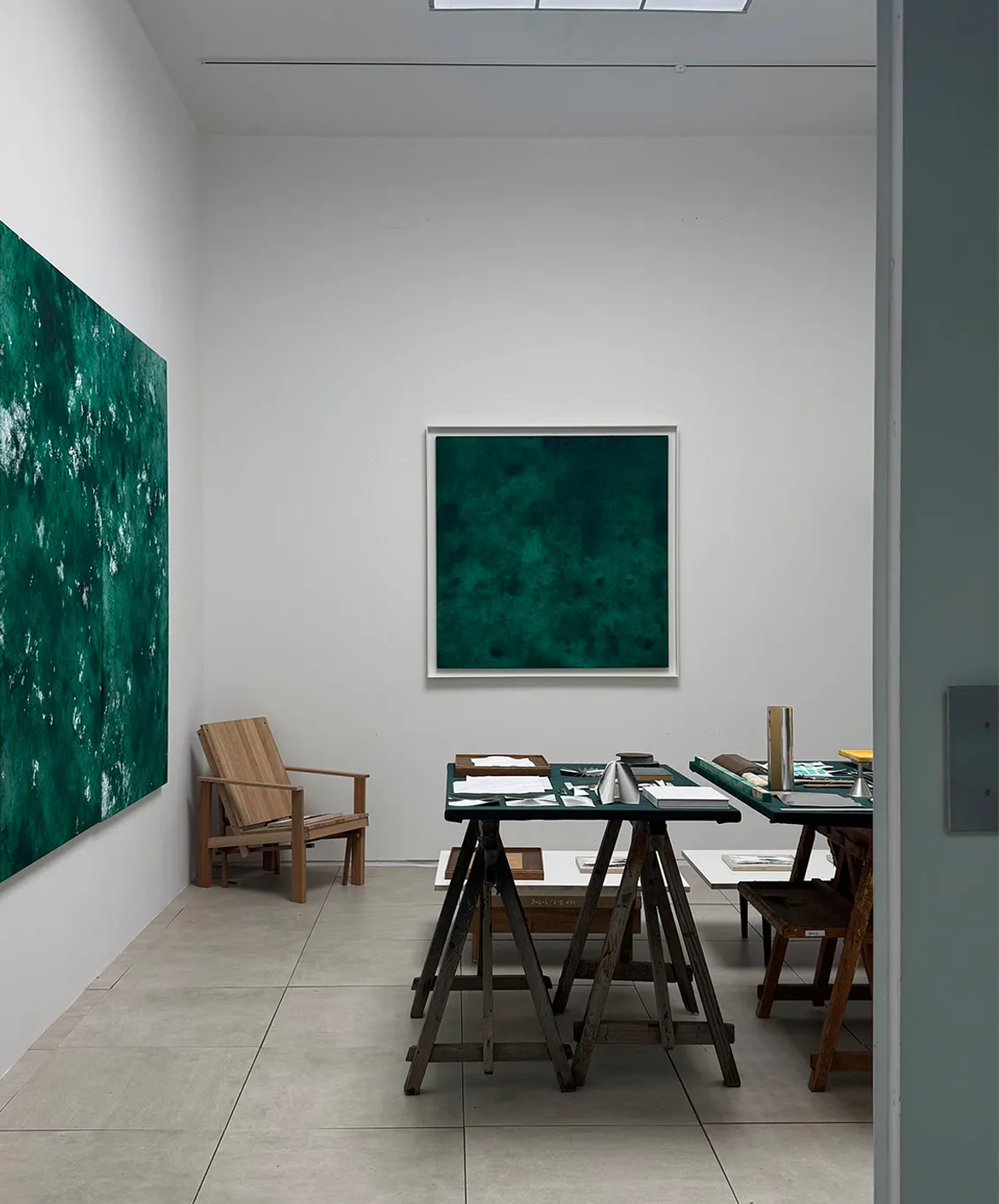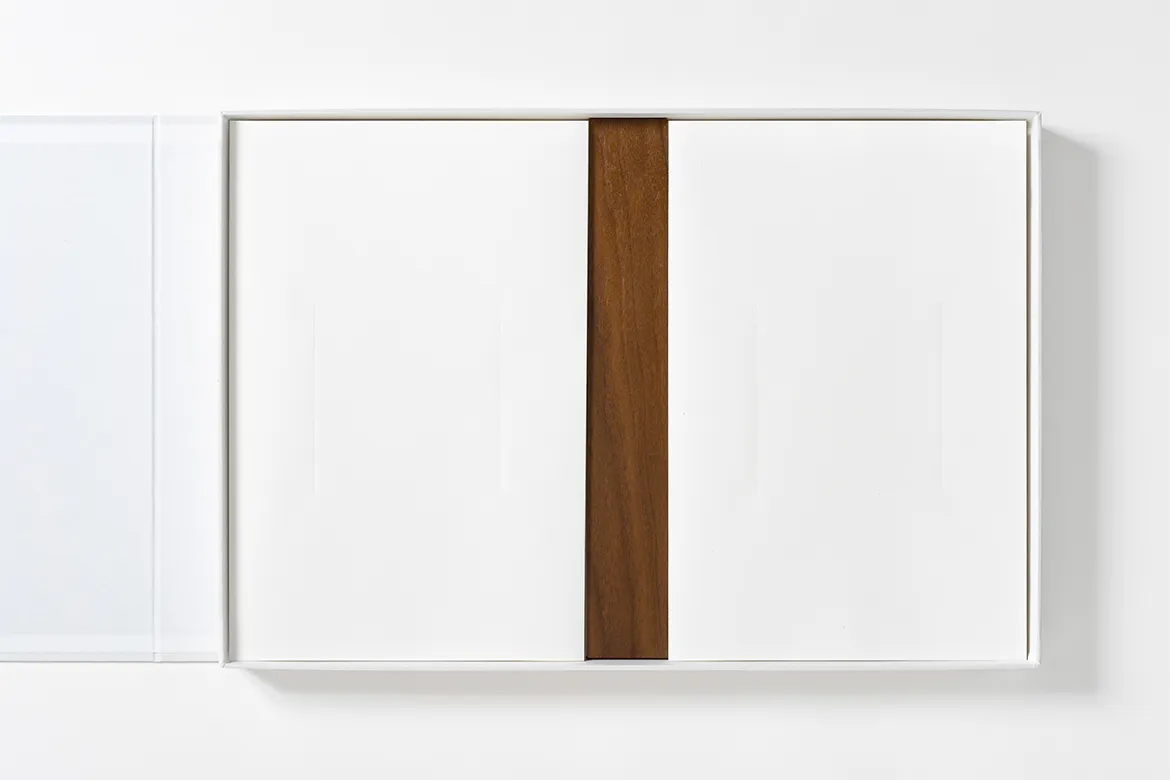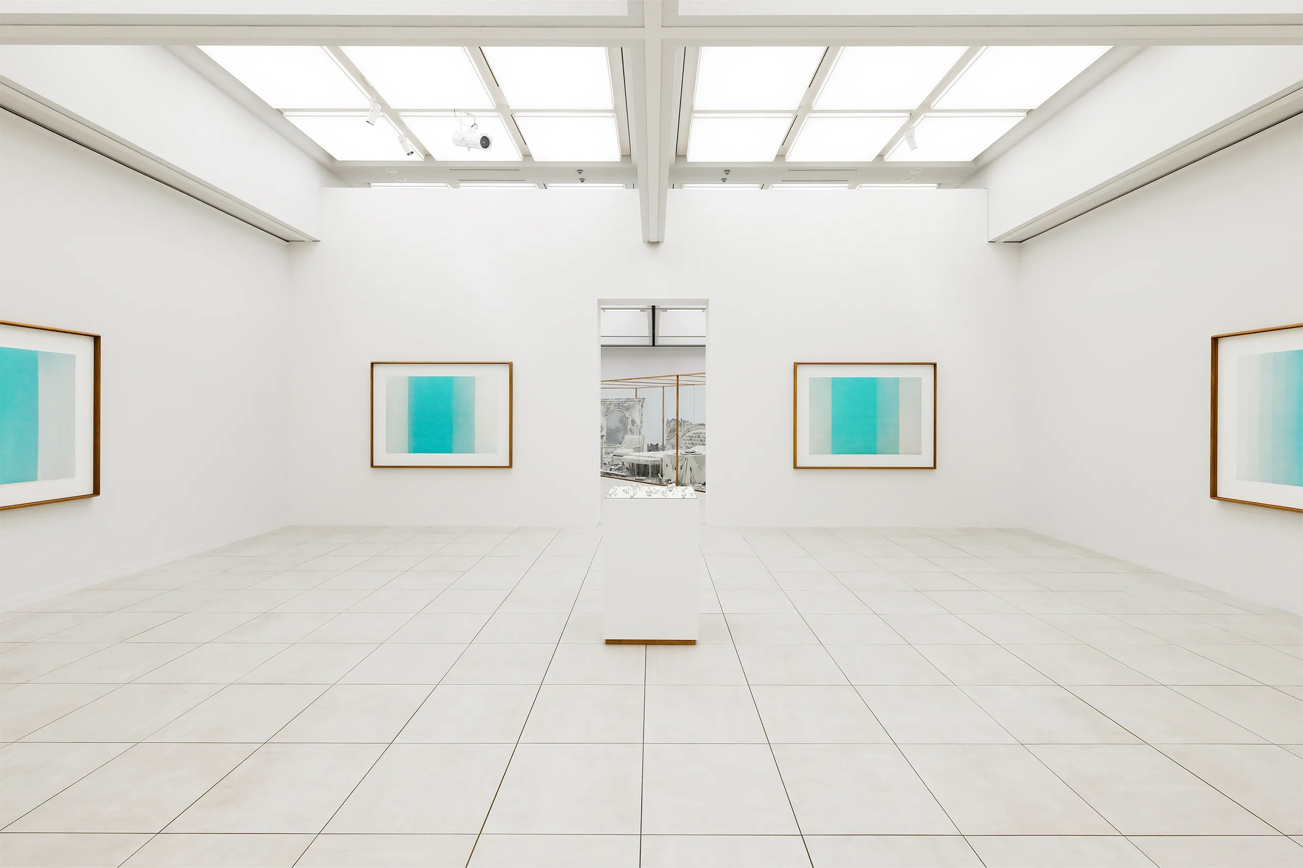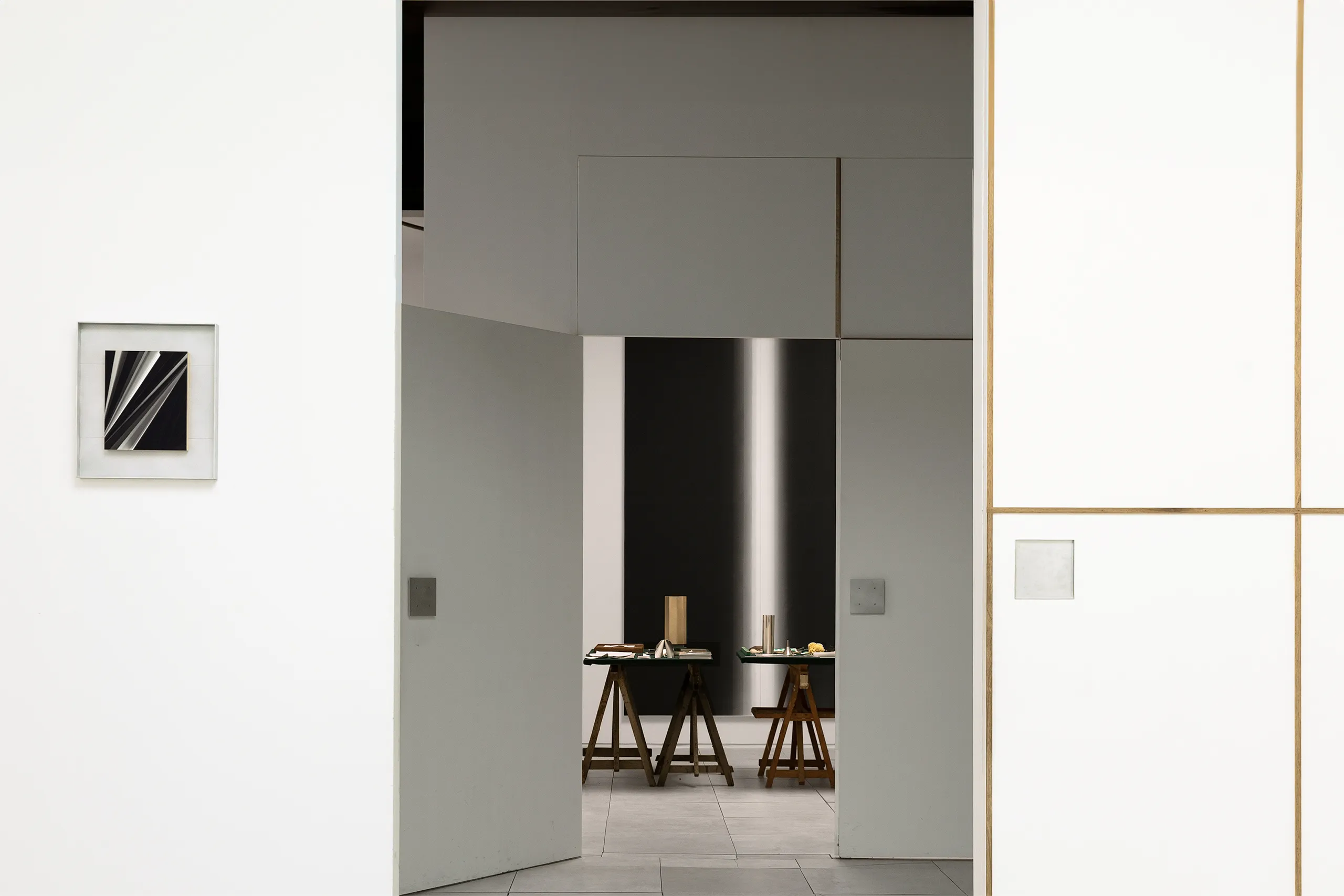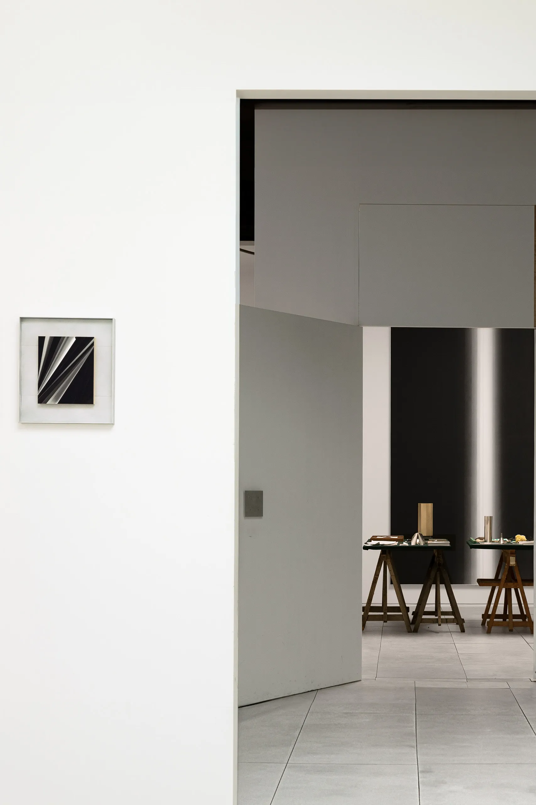 This series comprises two types: greenish-blue works made by folding a single sheet of coated watercolor paper into a polyhedral form, exposing it to sunlight, then unfolding it; and black-and-white photograms made in the same way on silver-gelatin photographic paper, exposed to a single light source. In the artist’s large, self-built darkroom, single sheets of photographic paper are hand-scored with straight fold lines—for example, up to 3m long—and folded into 48-sided forms before exposure. Using this method—capturing “only the light and shadow inherent to the object itself”—the gradations of light and shadow are fixed onto the paper…